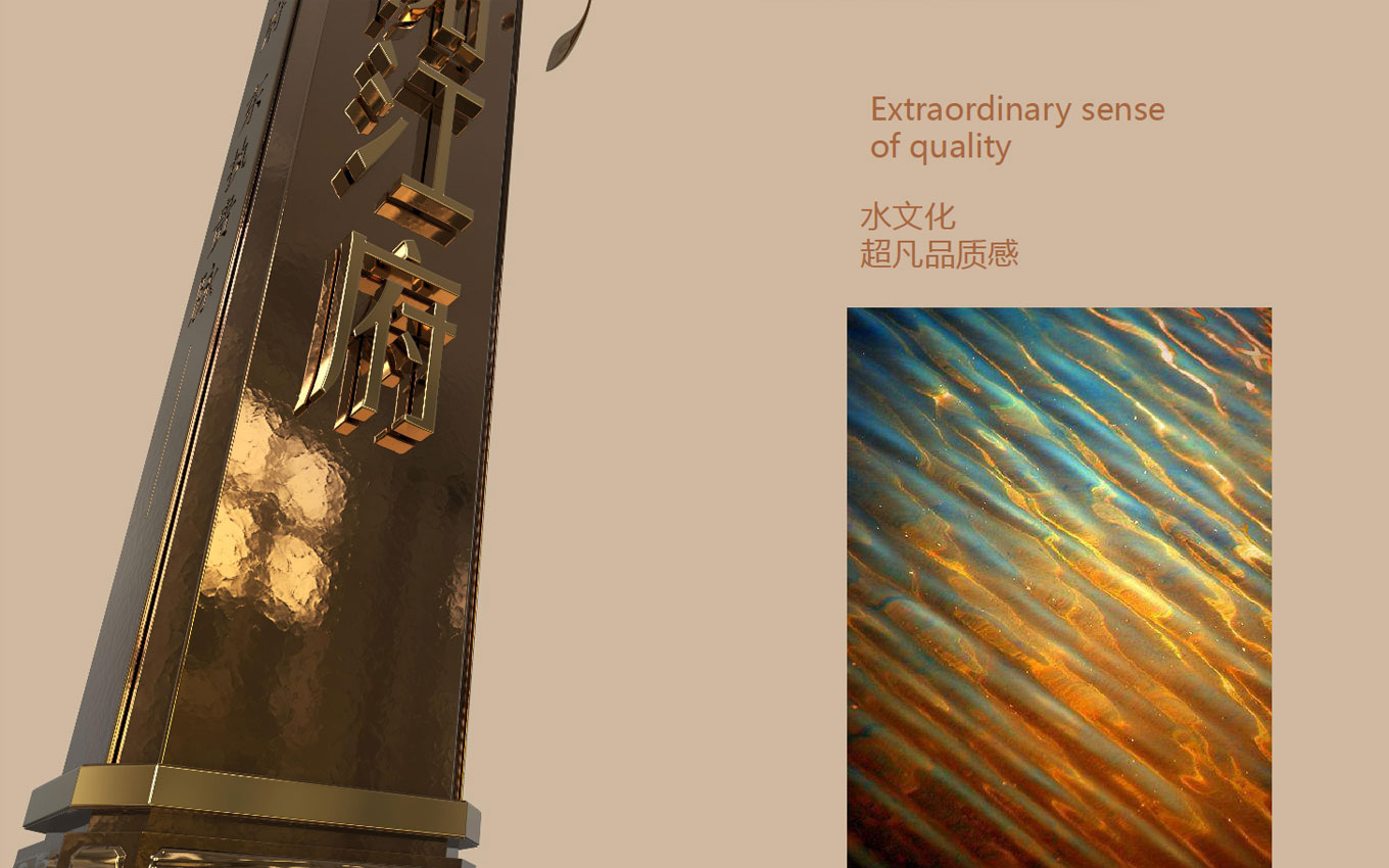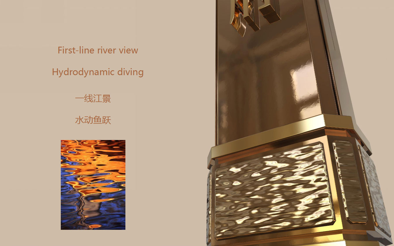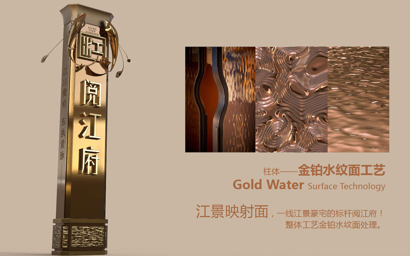 碧桂園閱江府地產標識設計,柱體以金鉑水紋面工藝制作,一線江景豪宅的標桿項目