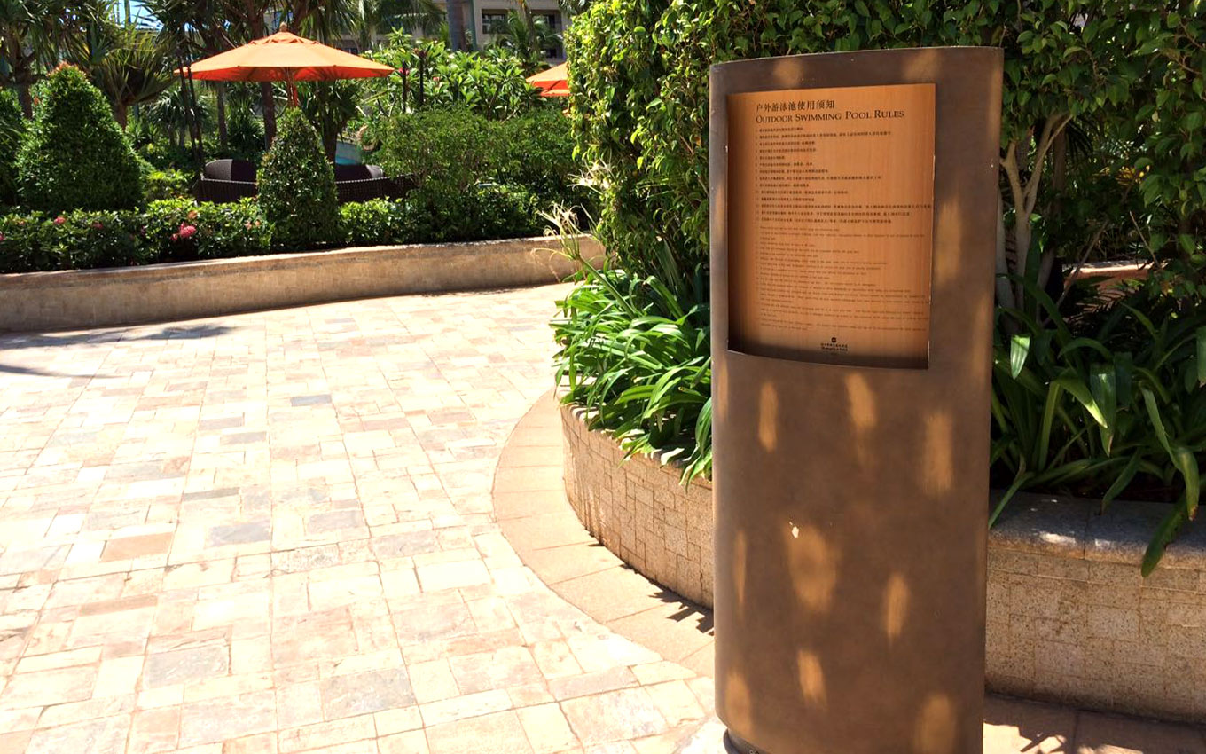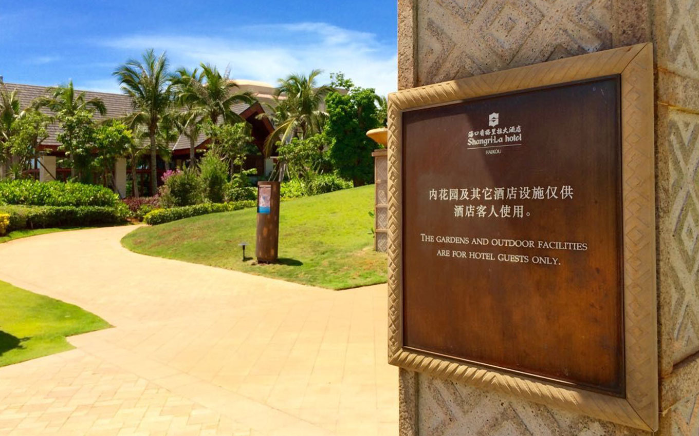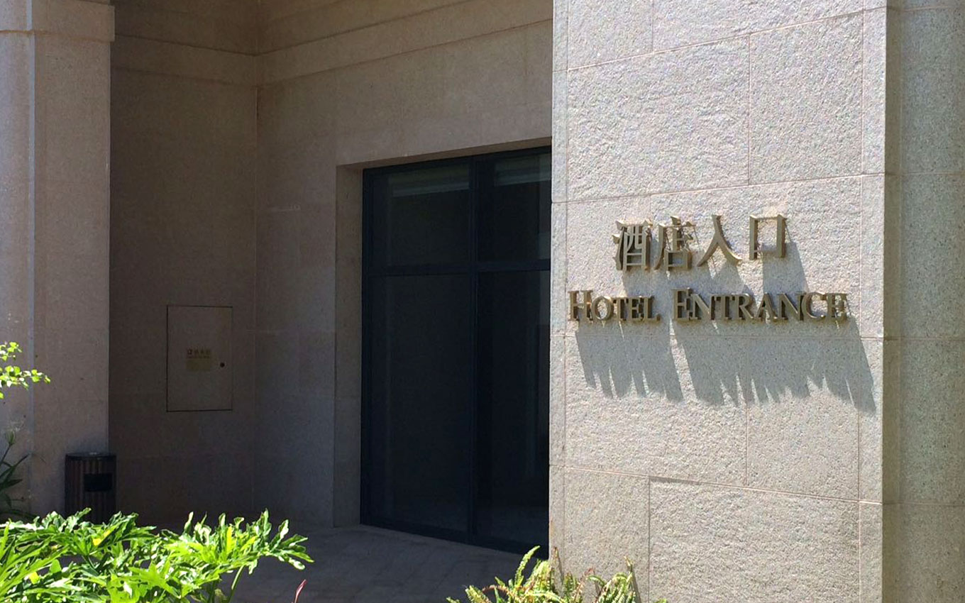 海口香格里拉大酒店位于??谑卸燃僦行模_叺奶烊幻谰啊⒑0毒€的風(fēng)光、椰風(fēng)的靜謐之處、這是??诙燃偬焯?,海口香格里拉大酒店標(biāo)識設(shè)計以海洋、??谝瑯滹L(fēng)光為設(shè)計創(chuàng)意,室外以古銅打造陽光下的度假方案導(dǎo)視設(shè)計,室內(nèi)以沙石雕花邊工藝制作,結(jié)合金屬質(zhì)感的點(diǎn)綴,形成鮮明的品質(zhì)感。